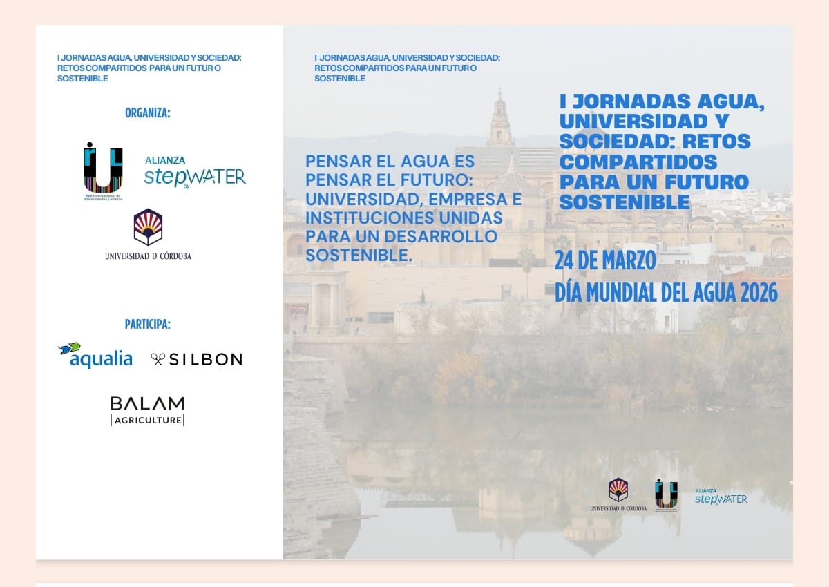 El próximo **24 de marzo**, con motivo del **Día Mundial del Agua 2026**, se celebrarán en la **Sala Mudéjar del Rectorado de la Universidad de Córdoba** las **I Jornadas Agua, Universidad y Sociedad: Retos compartidos para un futuro sostenible**.
