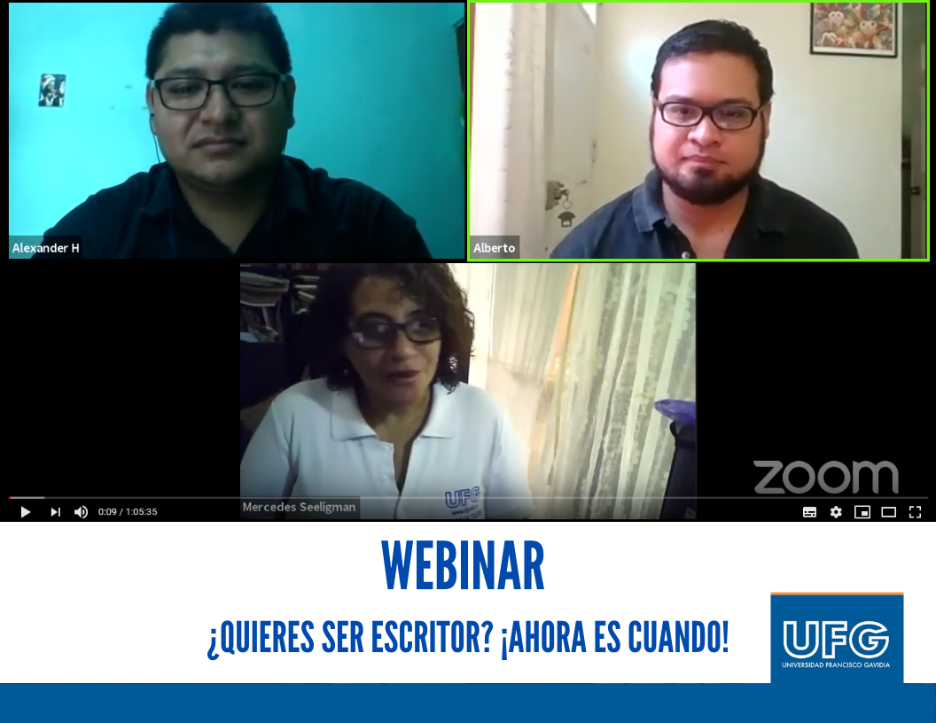 El pasado jueves 28 de mayo, la Universidad Francisco Gavidia a través de sus Unidades: Sistema Bibliotecario, UFG-Editores y Dirección de Desarrollo Estudiantil y el apoyo de la Red Avanzada de Investigación, Ciencia y Educación Salvadoreña realizaron el webinar titulado: ¿Quieres ser escritor? ¡Ahora es cuando!