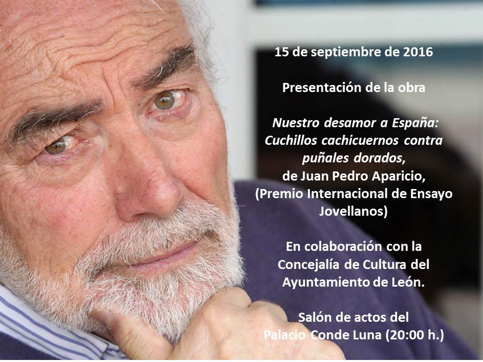 El Salón de Actos del Palacio Conde Luna de León acogerá a las 20:00 horas la presentación de la obra ‘Nuestro desamor a España: Cuchillos cachicuernos contra puñales dorados’, del escritor Juan Pedro Aparicio, en un acto que contará con la presencia del autor, y en el que intervendrá el director de la Biblioteca de la Universidad de León (ULE), Santiago Asenjo, y el profesor Eduardo Fuentes Ganzo.