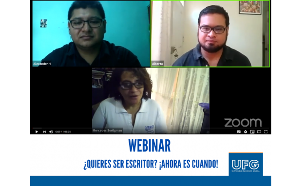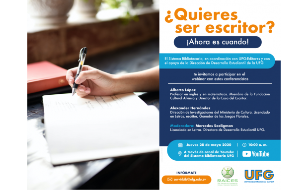 El pasado jueves 28 de mayo, la Universidad Francisco Gavidia a través de sus Unidades: Sistema Bibliotecario, UFG-Editores y Dirección de Desarrollo Estudiantil y el apoyo de la Red Avanzada de Investigación, Ciencia y Educación Salvadoreña realizaron el webinar titulado: ¿Quieres ser escritor? ¡Ahora es cuando!